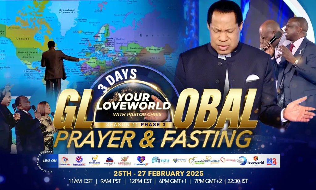We are excitedly counting up to the February edition of our monthly Global Prayer and Fasting Program, led by our most esteemed Man of God, the Loveworld President, Rev. Dr. Chris Oyakhilome, DSC, DSC, DD. The program will take place from Tuesday, February 25, 2025, to Thursday, February 27, 2025.