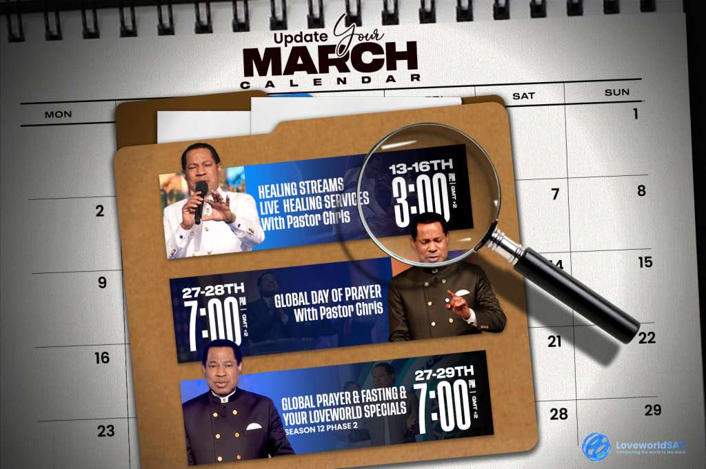 | Global Prayer, Fasting & Your Loveworld Specials | 27th – 29th March | 7:00 PM | Season 12, Phase 2: Aligning your life with God’s perfect timing. |